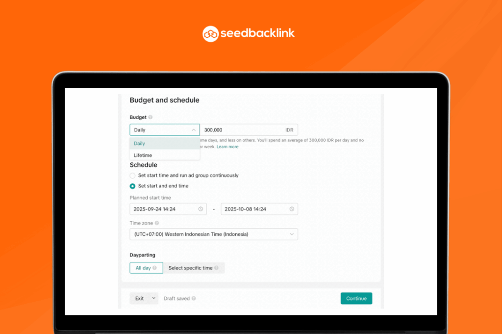 Setelahnya, Anda perlu menentukan berapa besar anggaran yang ingin dialokasikan untuk iklan serta mengatur jadwal penayangannya. TikTok menyediakan dua pilihan anggaran, yaitu daily budget (anggaran harian) dan lifetime budget (anggaran total selama periode kampanye). Anda juga bisa mengatur jadwal penayangan iklan, mulai dari tanggal mulai dan berakhirnya kampanye hingga jam tayang tertentu. Pengaturan ini membantu iklan lebih efisien. Jika telah selesai, klik continue.