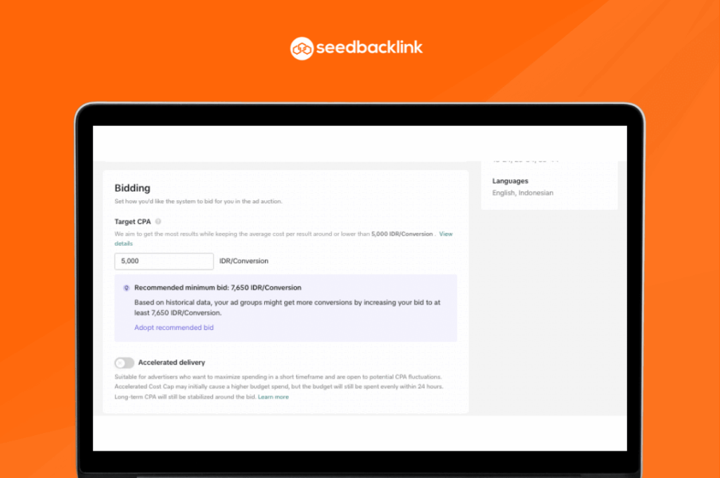 Dalam tahapan ini, Bidding adalah proses menentukan berapa biaya yang bersedia Anda keluarkan agar iklan bisa tampil dan mendapatkan hasil sesuai tujuan kampanye. Anda juga perlu memasukkan target CPA (Cost per Action) dalam bentuk rupiah. Target ini menjadi acuan sistem dalam mengatur penayangan iklan agar biaya per hasil sesuai dengan anggaran yang ditetapkan.