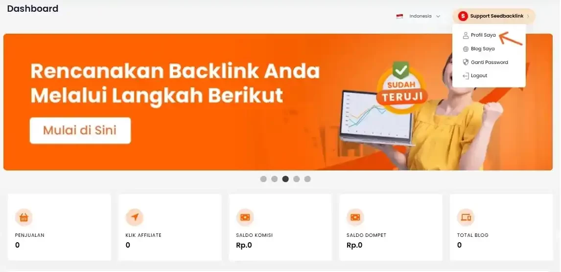 Setelah berhasil login, arahkan kursor ke bagian kanan atas halaman, lalu klik pada ikon profil. Pilih menu “Profil Saya” dari dropdown yang tersedia.