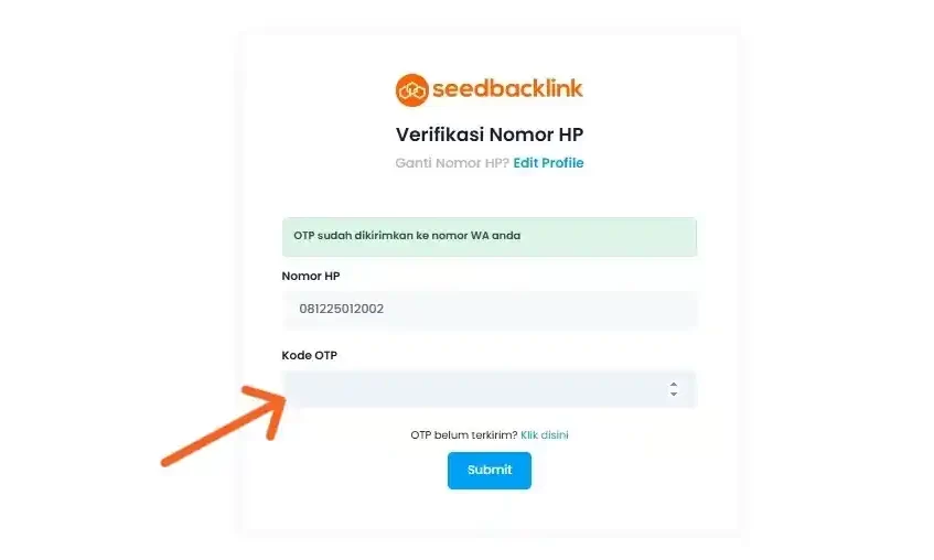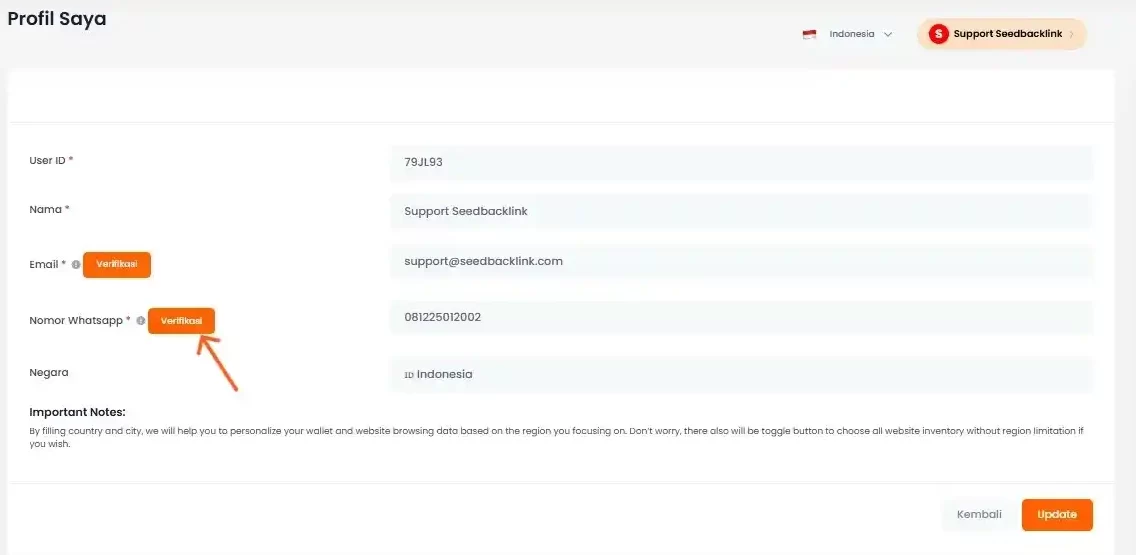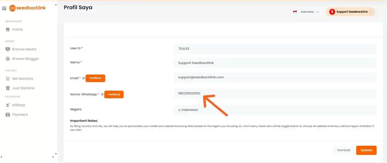 Dengan melakukan verifikasi nomor WhatsApp, kamu akan lebih mudah menerima notifikasi penting seperti update order, pemberitahuan sistem, serta komunikasi lainnya dari tim seedbacklink. Jadi, pastikan kamu sudah memverifikasikan nomor Whatsapp kamu ya.